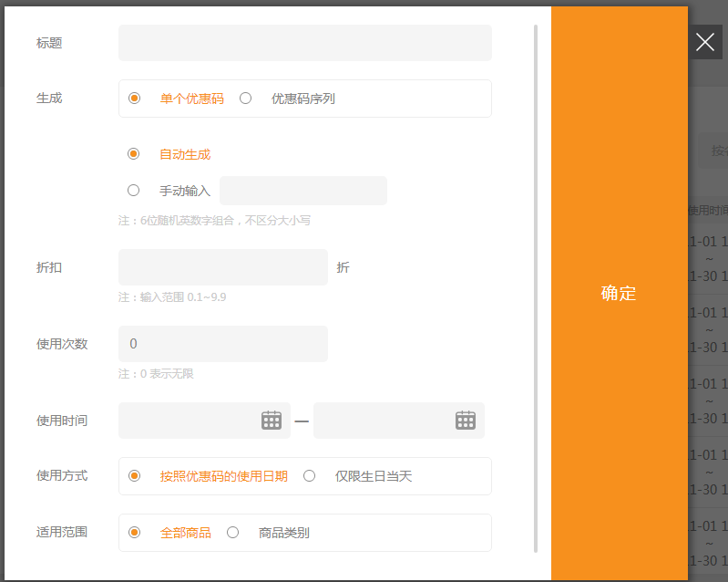 設(shè)置的優(yōu)惠碼使用次數(shù),是指單個優(yōu)惠碼能被所有會員使用的總次數(shù)。