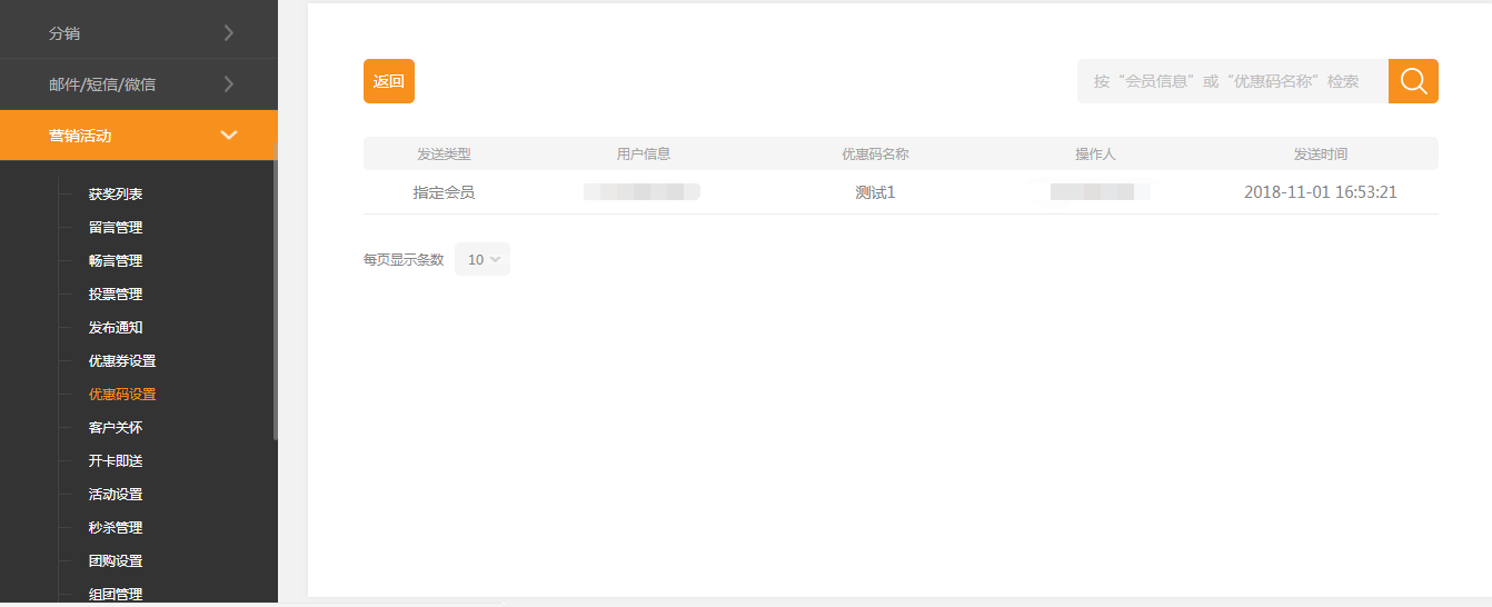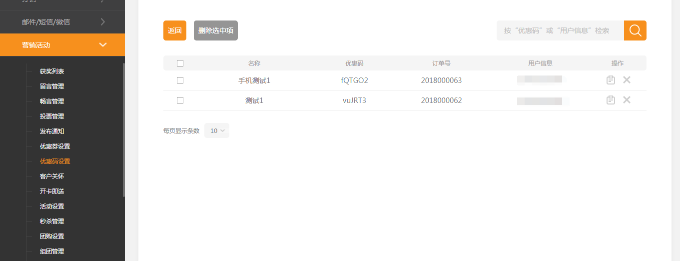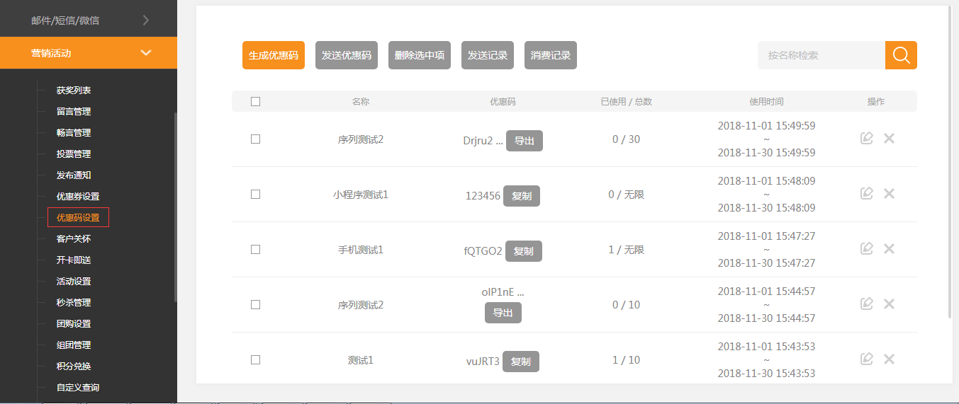 在建站后臺-“營銷活動”-“優(yōu)惠碼設(shè)置”中,可以對優(yōu)惠碼進(jìn)行瀏覽、復(fù)制、導(dǎo)出等操作,如圖所示: