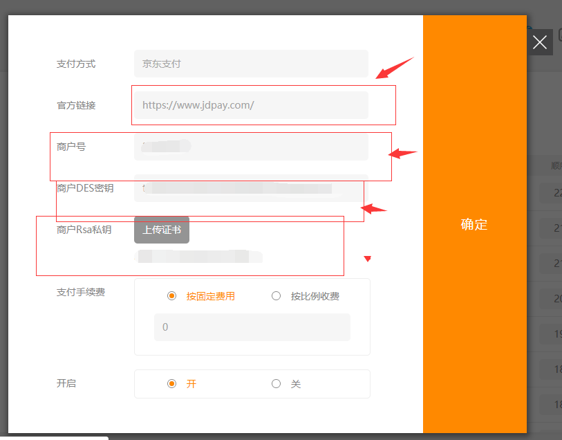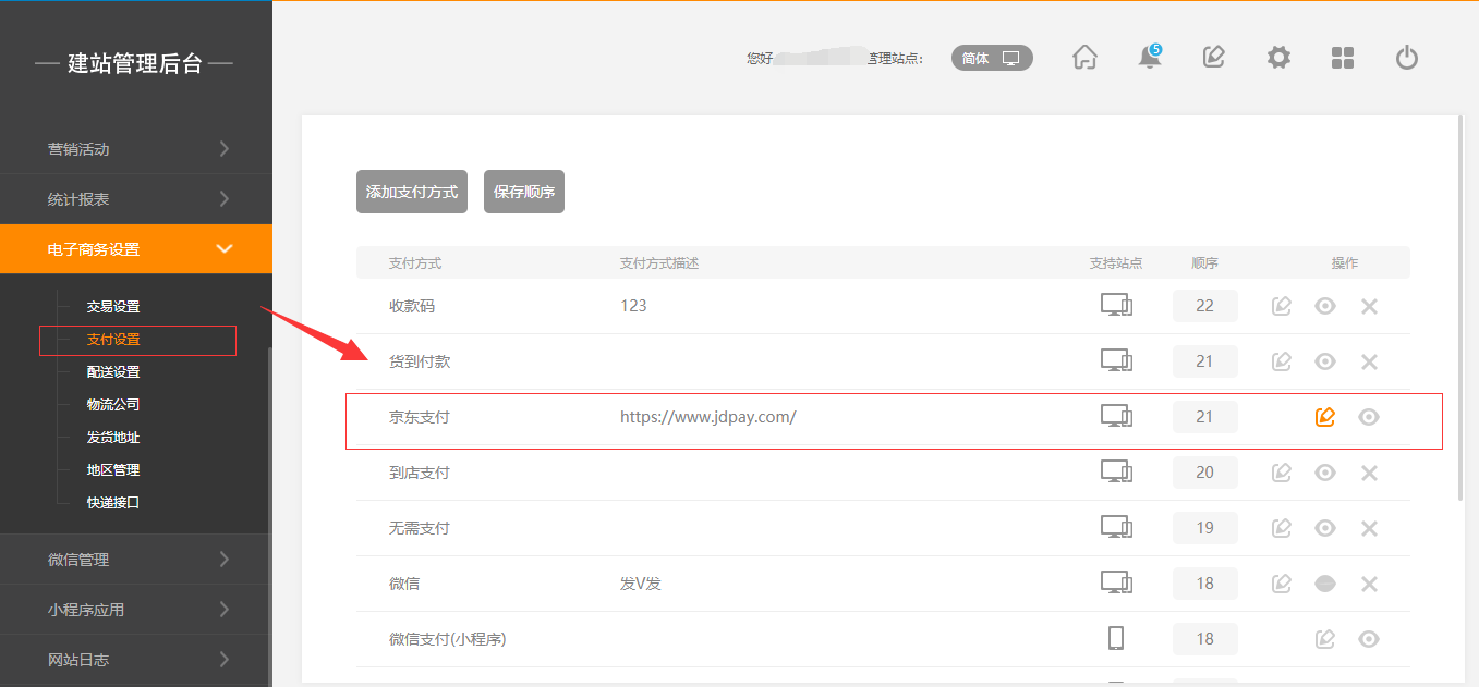 后臺-“電子商務(wù)設(shè)置”-“支付設(shè)置”-“京東支付”,點(diǎn)擊“編輯”,通過官方鏈接進(jìn)行商戶賬號申請后(注:請選擇快捷支付)根據(jù)京東支付網(wǎng)站中申請?zhí)崾具M(jìn)行操作,將得到的商戶號、密鑰等信息填寫完全,并上傳證書后將其開啟,點(diǎn)擊保存即可,如圖所示: