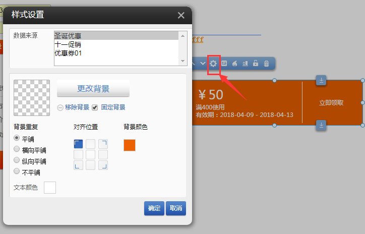 ③.點(diǎn)擊設(shè)置,數(shù)據(jù)來源可以選擇指定的優(yōu)惠券,并且可以設(shè)置優(yōu)惠券插件的樣式