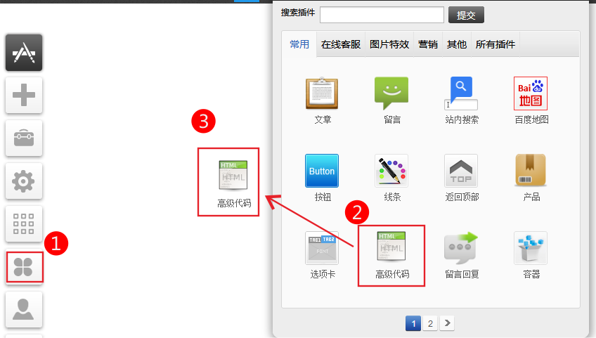 3、依次點擊插件-》常用-》選中高級代碼插件。把插件拖拽到需要的位置。