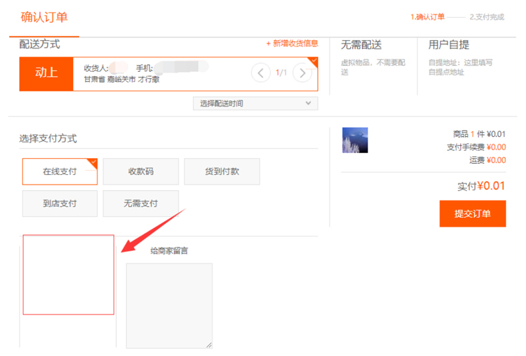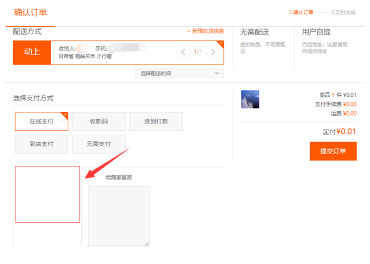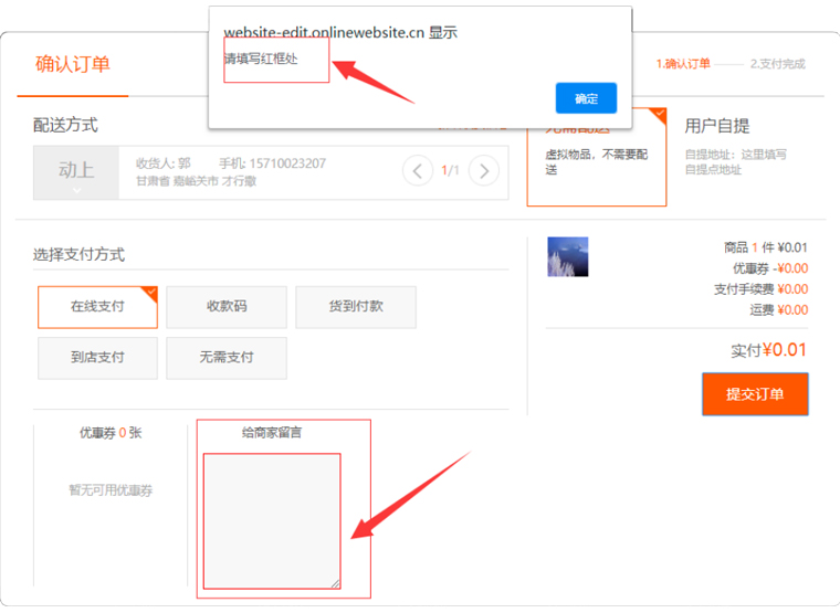 "留言框"是指在用戶購(gòu)買(mǎi)產(chǎn)品時(shí),提交訂單頁(yè)面下方的留言文本框中,用戶是否必須填寫(xiě)該內(nèi)容,支持"必填"或"選填",如圖所示: