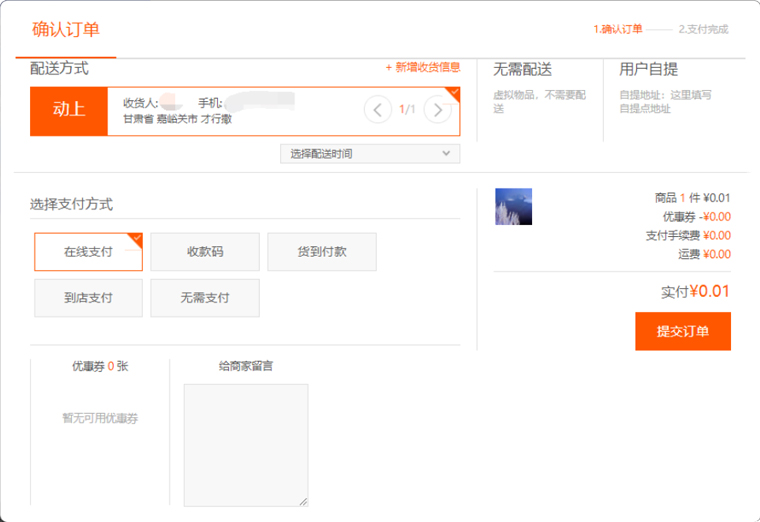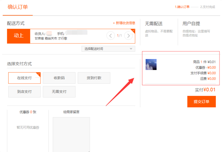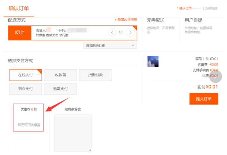 "優(yōu)惠券"是指當(dāng)選擇"開(kāi)啟"時(shí),前臺(tái)"提交訂單"頁(yè)面則會(huì)有優(yōu)惠券的顯示項(xiàng),并可以選擇相應(yīng)的優(yōu)惠券進(jìn)行使用;若選擇"關(guān)閉"則隱藏該顯示項(xiàng),如圖所示: