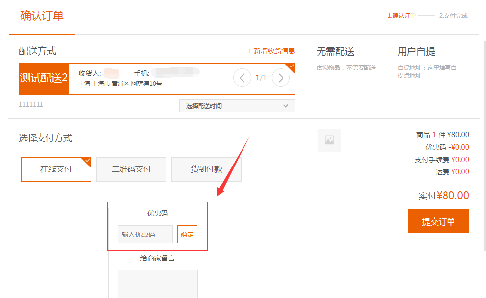 "優(yōu)惠碼"是指當(dāng)選擇"開(kāi)啟"時(shí),前臺(tái)"提交訂單"頁(yè)面則會(huì)有優(yōu)惠碼的顯示項(xiàng),并可以選擇相應(yīng)的優(yōu)惠碼進(jìn)行使用;若選擇"關(guān)閉"則隱藏該顯示項(xiàng),如圖所示: