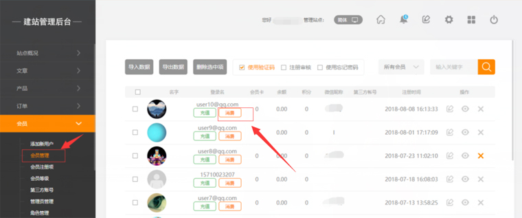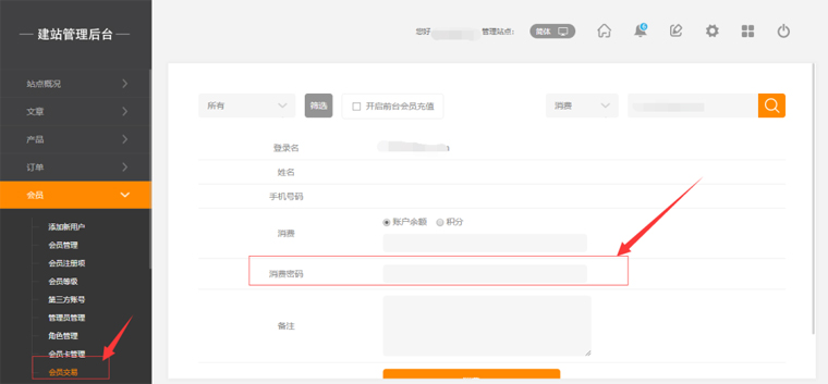 "消費(fèi)密碼"是網(wǎng)站管理員在進(jìn)行用戶消費(fèi)操作時(shí)的確認(rèn)密碼,不輸入正確的密碼則無(wú)法操作;若密碼為空則無(wú)需密碼即可操作,如圖所示: