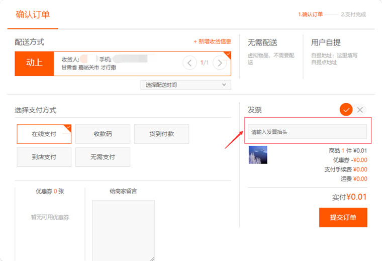 “發(fā)票開(kāi)關(guān)”是指在提交訂單頁(yè)面中是否顯示支持用戶開(kāi)具發(fā)票的選擇,當(dāng)“開(kāi)啟”后并選擇發(fā)票的種類“普通發(fā)票”或“增值稅發(fā)票”并保存后,前臺(tái)訂單提交頁(yè)面中將會(huì)顯示該內(nèi)容;若選擇“關(guān)閉”則將其隱藏,如圖所示: