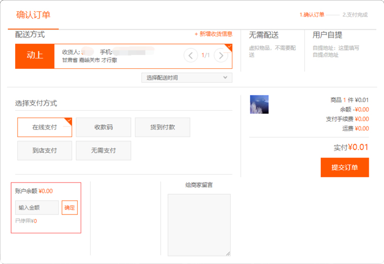 "余額"是指當(dāng)選擇"開(kāi)啟"時(shí),前臺(tái)"提交訂單"頁(yè)面則會(huì)有余額的顯示項(xiàng),并可以用余額進(jìn)行支付;若選擇"關(guān)閉"則隱藏該顯示項(xiàng),如圖所示: