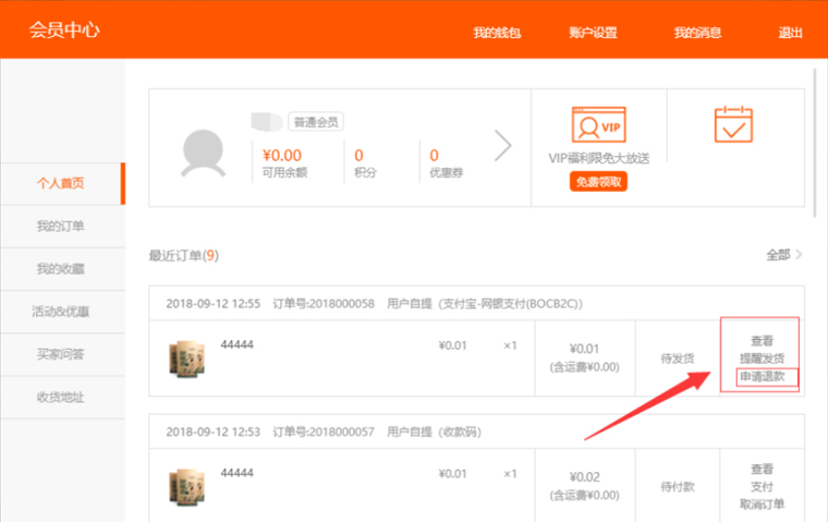"退款"是指當(dāng)選擇"開(kāi)啟"時(shí),前臺(tái)用戶使用在線支付購(gòu)買(mǎi)產(chǎn)品時(shí),在前臺(tái)"會(huì)員中心"-"我的訂單"中有"申請(qǐng)退款"的操作;選擇"關(guān)閉"時(shí)則不支持前臺(tái)用戶申請(qǐng)退款,如圖所示: