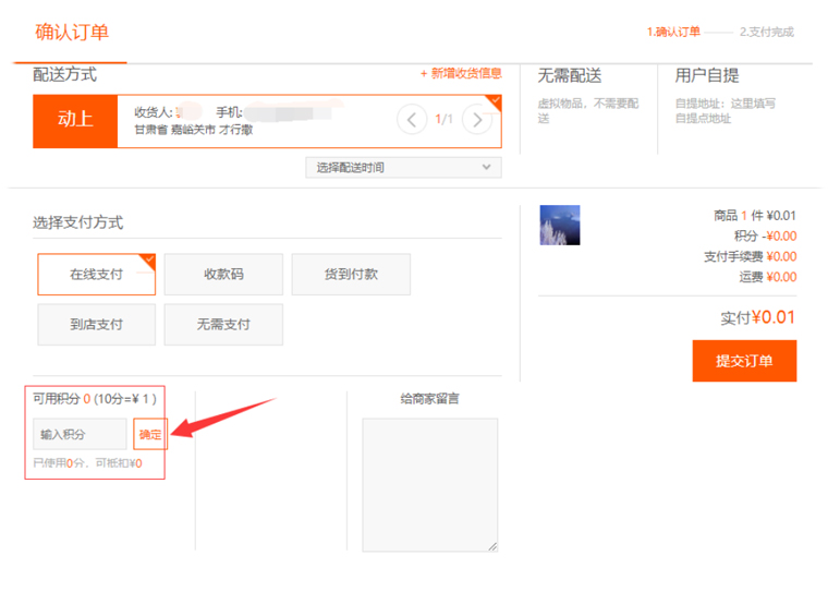 “積分”當(dāng)選擇“開(kāi)啟”時(shí),并填寫(xiě)相應(yīng)積分可抵扣的金額以及可使用的最大積分值等,在“提交訂單”頁(yè)面會(huì)有該積分的顯示項(xiàng),用戶可以使用“積分”減少相應(yīng)的金額;若選擇“關(guān)閉”則隱藏改顯示項(xiàng),如圖所示: