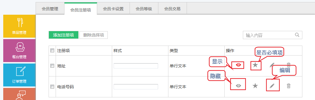 如果想讓某個注冊項在會員中心顯示,點擊變?yōu)榧t色眼睛圖標就可以了;不顯示就點擊變?yōu)榛疑劬D標。
