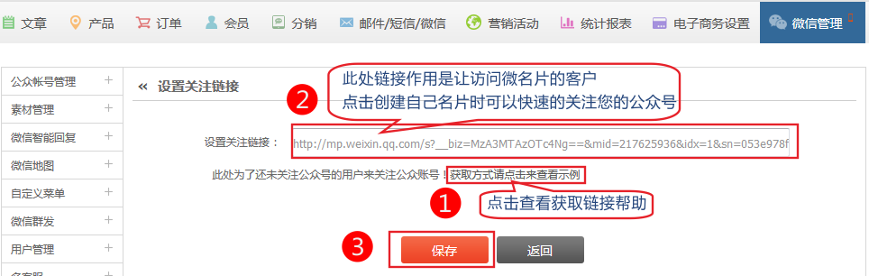 關(guān)注鏈接的作用,通過客戶分享出去的名片點(diǎn)擊進(jìn)來后,新的客戶點(diǎn)擊創(chuàng)建名片時引導(dǎo)用戶關(guān)注公眾號。