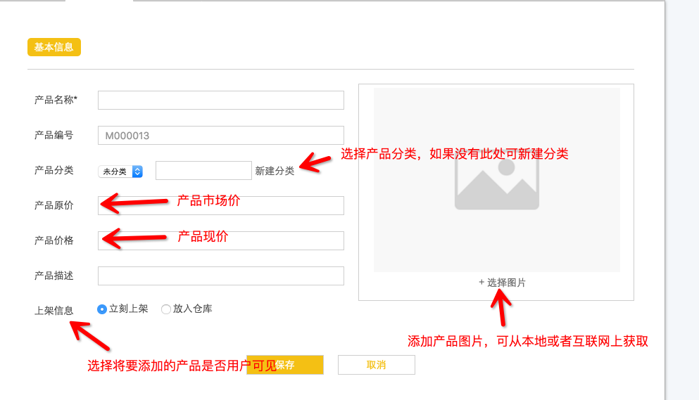 注意:帶“*”的為必填項(xiàng),填完保存即可完成產(chǎn)品的添加