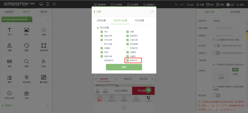 小程序端 建站前臺:“設置” — “會員中心”— 勾選“表單支付”后,在會員中心顯示“表單支付”即可查看支付的表單信息。