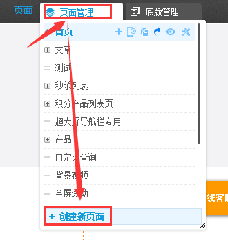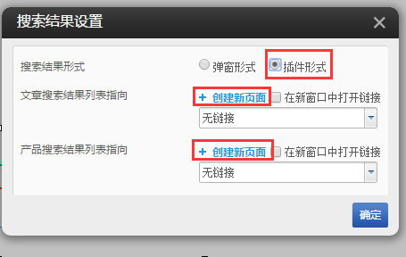 ④.點(diǎn)擊下圖中的創(chuàng)建新頁(yè)面,系統(tǒng)將自動(dòng)創(chuàng)建一個(gè)帶有文章搜索結(jié)果插件或者產(chǎn)品搜索結(jié)果插件的頁(yè)面。