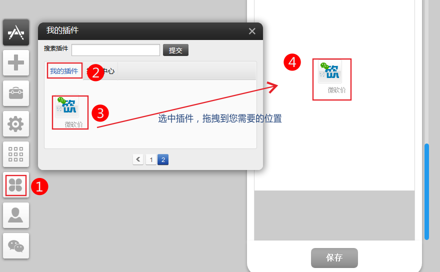 3、依次點(diǎn)擊 插件-》我的插件-微砍價(jià) 選中插件,并拖拽到您需要的位置。