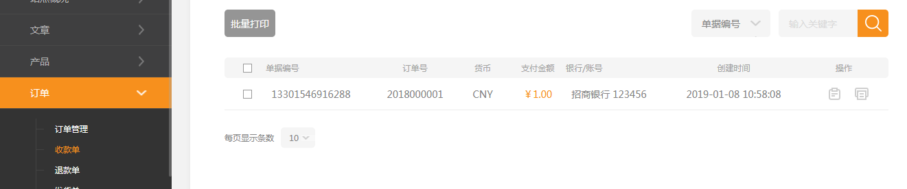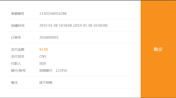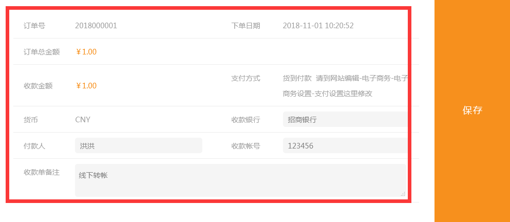 當(dāng)訂單狀態(tài)是未支付時(shí)(客戶無(wú)法使用網(wǎng)站提供的在線支付接口付款時(shí),通過(guò)線下轉(zhuǎn)帳、現(xiàn)金支付等方式收到的款)管理員在訂單中點(diǎn)擊支付后錄入收款信息會(huì)生成收款單