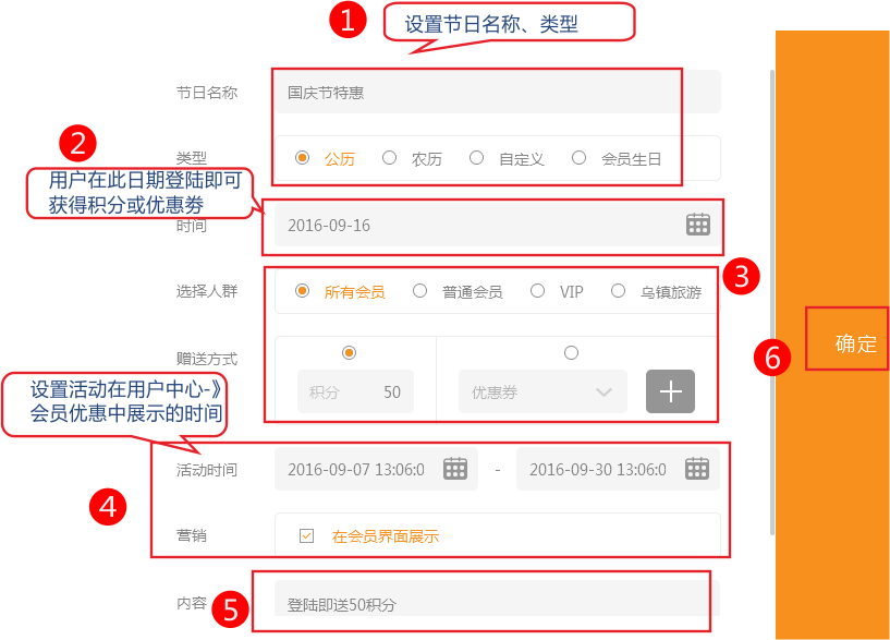 2.設(shè)置節(jié)日名稱、類型、活動(dòng)人群、節(jié)日時(shí)間、贈(zèng)送的內(nèi)容、在會(huì)員界面展示時(shí)間。