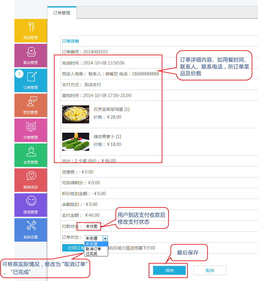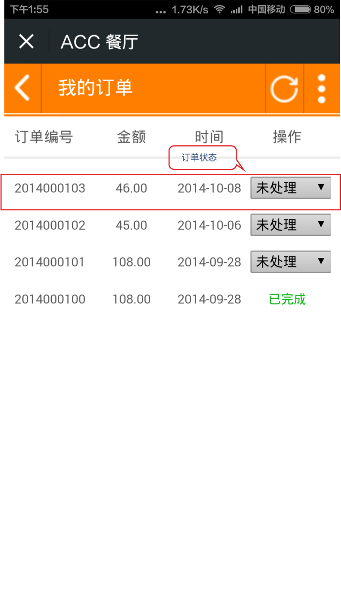 3)查看訂單詳情——點(diǎn)擊訂單后面的“查看 ”按鈕,進(jìn)入訂單詳情頁(yè),可查看訂單的基本信息和菜品信息。
