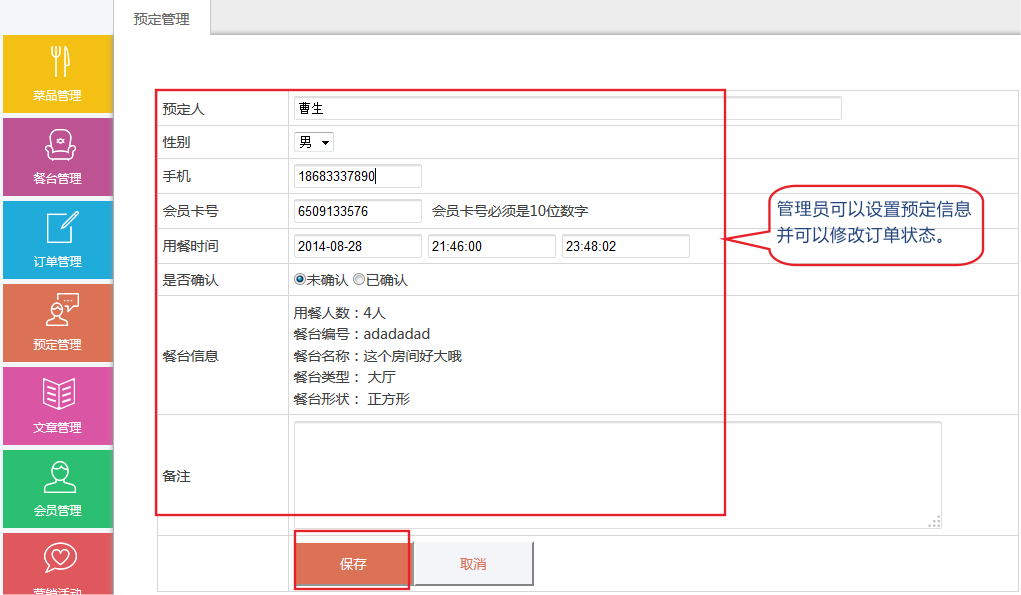 1.點擊預定管理,進入預定管理頁面,會出現(xiàn)客戶預訂的信息;