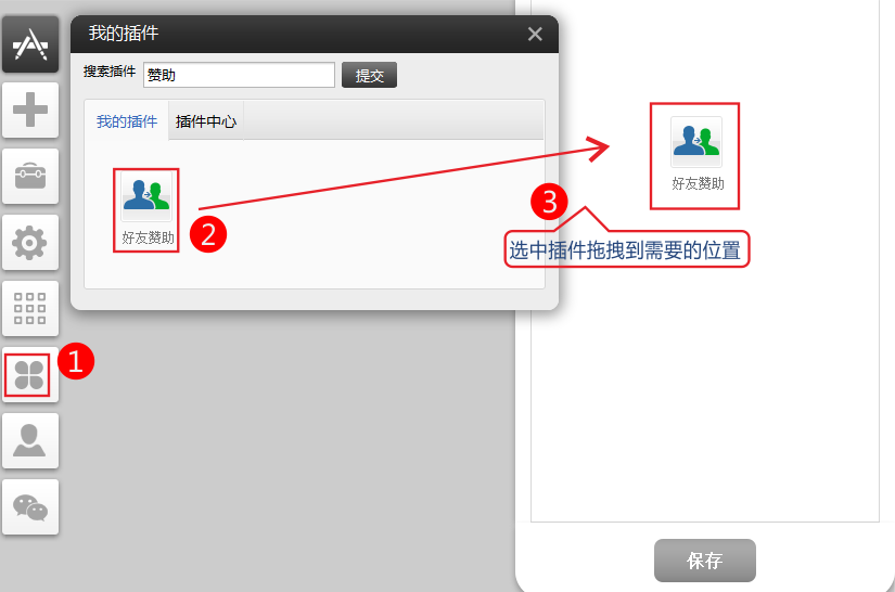 5.使用方法:進入網(wǎng)站編輯-〉點左側(cè)插件圖標-〉插件中心,找到好友贊助插件圖標,點啟用