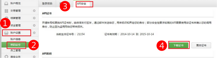 3.1 先登陸商戶平臺-》帳戶中心-》帳戶設(shè)置-》api安全-》點擊下載證書