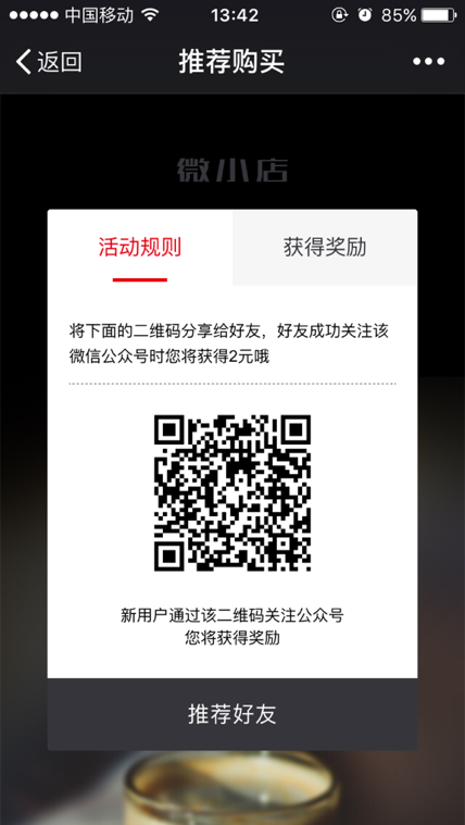 推薦贈送是指當把該公眾號二維碼分享給朋友并且朋友關注時將會獲得該獎勵。(有幾個好友掃二維碼關注公眾號就獲得幾次獎勵)