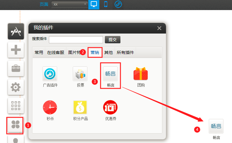 一.暢言使用方法PC和手機(jī)版搜狐暢言評(píng)論插件(適用版本基礎(chǔ)版、標(biāo)準(zhǔn)版、營銷版,至尊版)1.建站暢言設(shè)置進(jìn)入網(wǎng)站編輯-〉點(diǎn)左側(cè)插件圖標(biāo)-〉營銷找到暢言插件,拖拽到需要位置支持評(píng)論當(dāng)前頁面,評(píng)論文章,評(píng)論產(chǎn)品在網(wǎng)站后臺(tái)營銷活動(dòng)、暢言管理中配置Appid和Appkey2.暢言官網(wǎng)設(shè)置(1)先在暢言官網(wǎng)http://changyan.kuaizhan.com/注冊(cè)注冊(cè)后點(diǎn)擊去在http://changyan.kuaizhan.com/guide/index頁面選擇通用網(wǎng)站用戶然后選擇pc站點(diǎn)按提示填入即可(2)配置規(guī)則評(píng)論配置完成后不需要獲取任何代碼,直接進(jìn)入后臺(tái)總覽(3)獲取APPID和A