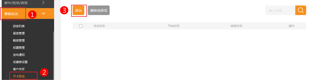 1、依次點(diǎn)擊營銷活動(dòng)-》開卡即送-》添加 2、設(shè)置活動(dòng)名稱、時(shí)間、贈(zèng)送策略、是否在用戶領(lǐng)卡界面顯示,即可生成一個(gè)完整的開卡即送活動(dòng)。 如需讓用戶知道當(dāng)前有開卡活動(dòng),可勾選“在用戶領(lǐng)卡界面展示”,所有開卡活動(dòng)僅可開啟一條,開啟后可展示。 注:贈(zèng)送積分或券僅可選擇一種,贈(zèng)送券的數(shù)量最大上限是3張券,需優(yōu)先在優(yōu)惠券內(nèi)編輯好才可勾選; 【券的開始時(shí)間】必須在【開卡贈(zèng)送開始時(shí)間】之后,【券的結(jié)束時(shí)間】必須在【開卡贈(zèng)送結(jié)束時(shí)間】之后,此類券才符合條件,可勾選贈(zèng)送。 3、在用戶中心-》點(diǎn)擊我的錢包-