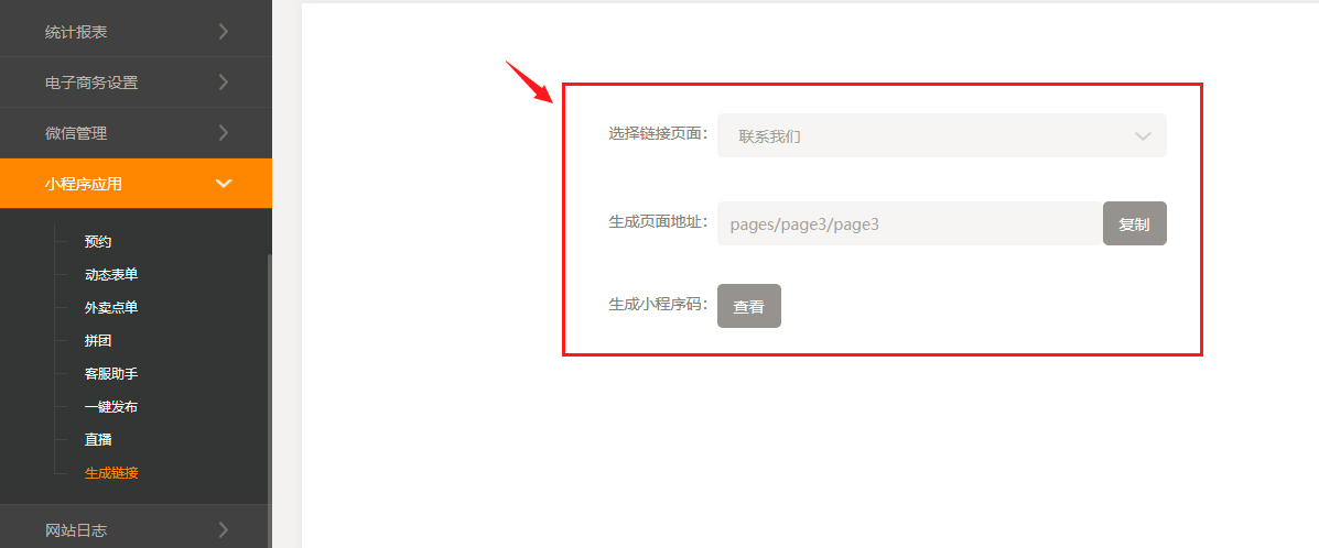 1.在建站后臺(tái),“小程序應(yīng)用”中,新增了“生成鏈接”功能,選擇頁面后,生成頁面地址一欄即自動(dòng)顯示出地址,小程序碼也會(huì)自動(dòng)生成。注:使用此功能需先配置好小程序ID和密鑰;小程序碼在小程序發(fā)布后才能看到。2.當(dāng)選擇的頁面中有產(chǎn)品詳情插件時(shí),可以選擇具體的產(chǎn)品來生成地址,如圖所示: