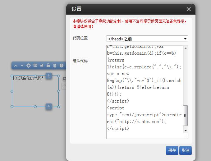 pc跳轉(zhuǎn)手機(jī),意思是指,比如域名abc.com,配置了www.abc.com,選擇pc綁定,又配置了m.abc.com,選擇手機(jī)綁定想要訪問我網(wǎng)站的用戶手機(jī)里面打開www.abc.com,自動(dòng)跳轉(zhuǎn)到m.abc.com方法如下:1.pc跳轉(zhuǎn)手機(jī)代碼如下<scripttype="text/javascript">functionuaredirect(f){try{if(document.getElementById("bdmark")!=null){return}varb=false;if(arguments[1]){vare=window.location.host;vara=window.location.href;if(isSubdomain(arguments[1],e)==1){f=f+"/#m/"+a;b=true}else{if(isSubdomain(ar