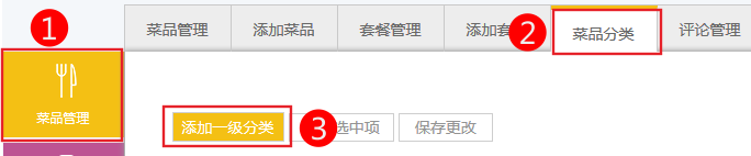 小節(jié)共包含5點(diǎn)。1、看完本節(jié)內(nèi)容您應(yīng)該知道: 添加菜品分類往往是第一步的,一個(gè)商品必須添加在一個(gè)分類下 添加分類以后,您可以對(duì)分類的順序進(jìn)行調(diào)整,讓您認(rèn)為重要的分類顯示在前面。 2、添加分類 1.依次點(diǎn)擊菜品管理-菜品分類 2.錄入頂級(jí)分類名稱。 如果還有添加頂級(jí)分類點(diǎn)擊添加一級(jí)分類即可 添加完完畢以后點(diǎn)擊保存更改,可以在分類列表中看到它 添加完完畢以后,可以在分類列表中看到它 3、調(diào)整分類的顯示順序 可能我們一開始添加的順序,未必就是我們真正想要的顯示順序,特別是網(wǎng)站網(wǎng)頁顯示的分類順序,往往會(huì)根