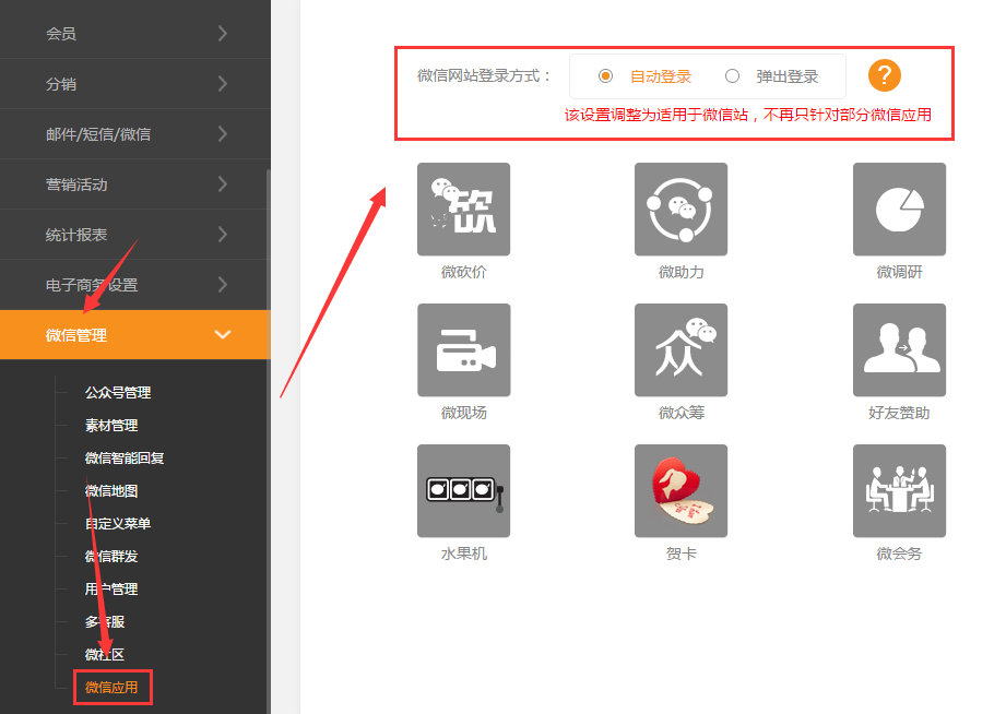 ??微信站可以設(shè)置自動登錄(營銷版)①.原本的微信應(yīng)用登錄方式設(shè)置改為針對微信站,默認(rèn)是自動登錄,必須是認(rèn)證過的服務(wù)號才可以使用此功能自動登錄:用戶在進(jìn)入網(wǎng)站,系統(tǒng)會自動生成一個隨機(jī)賬號,用戶可以在會員中心---賬戶設(shè)置中進(jìn)行修改,只能修改一次,請謹(jǐn)慎填寫賬戶名彈出登錄:就是目前需要輸入賬號和密碼的形式來登錄②.角色管理增加微信站登錄設(shè)置權(quán)限微信管理---微信應(yīng)用這塊,增加了微信網(wǎng)站登錄方式的權(quán)限?