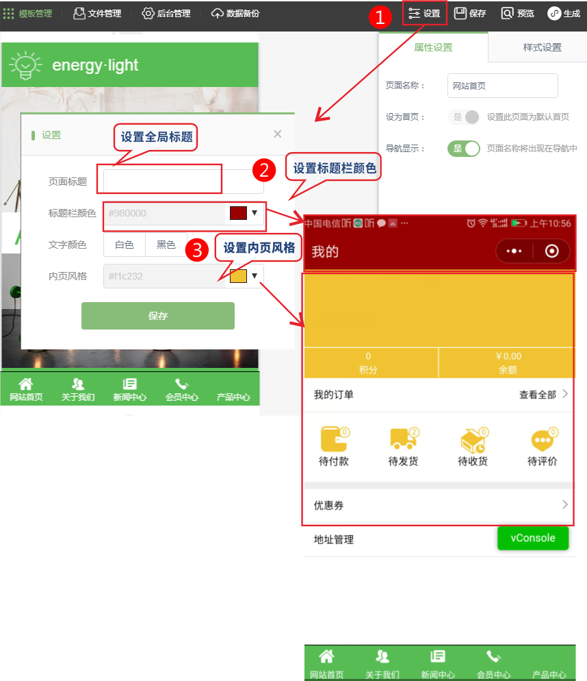 一、點(diǎn)擊設(shè)置可以設(shè)置頁面全局標(biāo)題、標(biāo)題欄顏色、文字顏色、和內(nèi)頁風(fēng)格。具體對應(yīng)如下圖:如果要設(shè)置單獨(dú)的頁面名稱在右側(cè)點(diǎn)擊設(shè)置即可