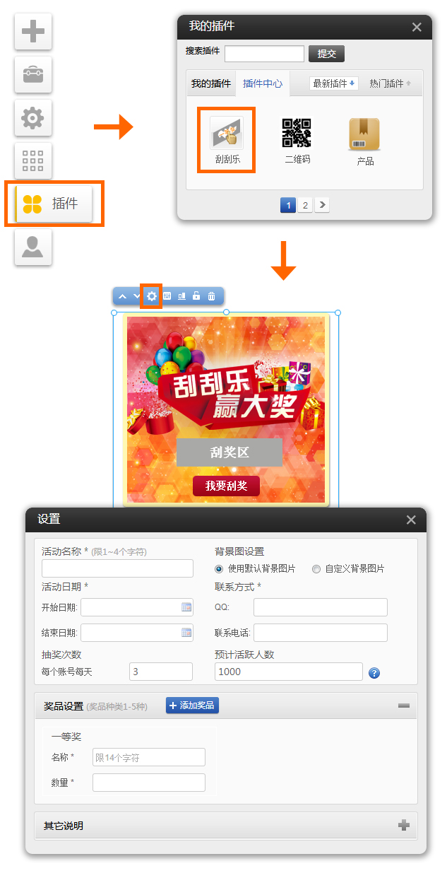 手機(jī)版插件(適用版本基礎(chǔ)版、標(biāo)準(zhǔn)版、營(yíng)銷版) 刮刮樂(lè)插件 使用方法:進(jìn)入網(wǎng)站編輯-〉點(diǎn)左側(cè)插件圖標(biāo)-〉插件中心,找到刮刮樂(lè)圖標(biāo),點(diǎn)啟用 可以使用此插件進(jìn)行營(yíng)銷推廣,增加用戶粘性。 在微信自定義菜單或關(guān)鍵詞回復(fù)里可以設(shè)置鏈接到含有刮刮樂(lè)插件的手機(jī)頁(yè)面,實(shí)現(xiàn)微信營(yíng)銷活動(dòng)。 中獎(jiǎng)概率=某個(gè)獎(jiǎng)項(xiàng)數(shù)量/max(每個(gè)賬號(hào)每天抽獎(jiǎng)次數(shù)*所有獎(jiǎng)項(xiàng)數(shù)量之和或每個(gè)賬號(hào)每天抽獎(jiǎng)次數(shù)*活躍人數(shù)) 注:公式中的分母取A和B2者最大值 A每個(gè)賬號(hào)每天抽獎(jiǎng)次數(shù)*活躍人數(shù) B每個(gè)賬號(hào)每天抽獎(jiǎng)次數(shù)*所有獎(jiǎng)項(xiàng)數(shù)量之和 中獎(jiǎng)信息 請(qǐng)?jiān)诤笈_(tái)