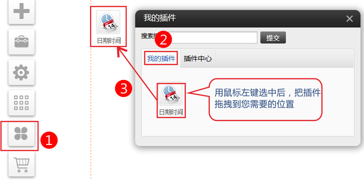 PC和手機(jī)版(適用版本基礎(chǔ)版、標(biāo)準(zhǔn)版、營(yíng)銷版) 1、依次點(diǎn)擊插件-我的插件-選中“日期時(shí)間”插件拖拽到您需要的位置。(如果“我的插件”中沒(méi)有,請(qǐng)到插件中心選啟用) 2、點(diǎn)擊設(shè)置選擇需要的展示的樣式。 3、您也可以自定義展示樣式。 各符號(hào)的意義 年(YY=14YYYY=2014)月(MM=03MMMM=3月)日(Do=1日DD=01)星期(dd=一dddd=星期一) h=小時(shí)m=分鐘s=秒a=上午或下午 h=12小時(shí)H=24小時(shí) hh,mm,ss=零起始h,m,s=非零起始 []=符號(hào)內(nèi)輸入文字會(huì)直接顯示 4、設(shè)置后效果如下圖 5、