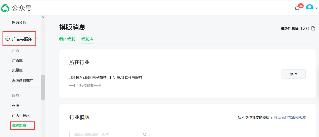 注意:僅營(yíng)銷版及以版本支持網(wǎng)站用戶綁定微信后,可以使用微信接收訂單提醒信息或找回密碼驗(yàn)證碼!此功能必須是認(rèn)證后的服務(wù)號(hào)才能使用!流程:1、微信官方后臺(tái)模板消息中模板添加2、后臺(tái)微信模板設(shè)置中編輯、并開(kāi)啟3、在公眾賬號(hào)中引導(dǎo)用戶綁定賬戶4、后臺(tái)中可以查看發(fā)送記錄1、登陸微信官方后臺(tái)在廣告與服務(wù)中找到模板消息在微信官方后臺(tái),先申請(qǐng)模板消息模塊,然后模板庫(kù)中有各式各樣模板,開(kāi)啟對(duì)應(yīng)的模板,獲得模板ID!申請(qǐng)模板消息 從模板庫(kù)中選擇模板注意選擇It科技/互聯(lián)網(wǎng)|電子商務(wù)、it科技/軟件與服務(wù)行業(yè)| 2:在網(wǎng)站后臺(tái)微信模