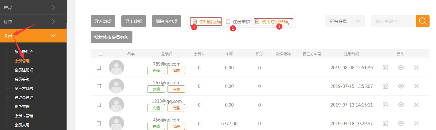 依次點(diǎn)擊會(huì)員->會(huì)員管理,可以看到網(wǎng)店內(nèi)注冊(cè)的所有會(huì)員。如圖所示:1.注冊(cè)審核開(kāi)啟后新注冊(cè)的用戶都需要管理員審核后才能登陸網(wǎng)站。2.使用驗(yàn)證碼勾選后在前臺(tái)登陸和注冊(cè)時(shí)都需要輸入驗(yàn)證碼。如果啟用了該項(xiàng),則客戶在登錄的時(shí)候,會(huì)需要輸入顯示在登錄窗口的驗(yàn)證碼:開(kāi)啟后在注冊(cè)時(shí)也需要輸入驗(yàn)證碼。3.開(kāi)啟使用忘記密碼,用戶可以在前臺(tái)使用找回密碼功能。需要注意的是,如果是電腦端,還需要在模塊的樣式設(shè)置里面勾選顯示4.可以通過(guò)會(huì)員卡、名字、登陸名,搜索用戶。5.通過(guò)微信自動(dòng)登陸生成的會(huì)員在可以在會(huì)員管理=》帳戶設(shè)置中設(shè)置