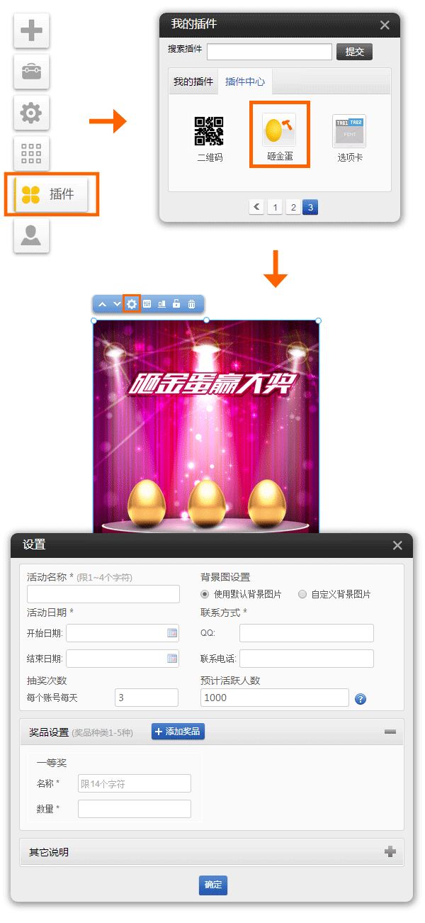 手機(jī)版插件適用版本(基礎(chǔ)版、標(biāo)準(zhǔn)版、營(yíng)銷版)砸金蛋插件(僅手機(jī)版本支持)使用方法:進(jìn)入網(wǎng)站編輯-〉點(diǎn)左側(cè)插件圖標(biāo)-〉插件中心,找到砸金蛋圖標(biāo),點(diǎn)啟用可以使用此插件進(jìn)行營(yíng)銷推廣,增加用戶粘性。在微信自定義菜單或關(guān)鍵詞回復(fù)里可以設(shè)置鏈接到含有砸金蛋插件的手機(jī)頁(yè)面,實(shí)現(xiàn)微信營(yíng)銷活動(dòng)。中獎(jiǎng)概率=某個(gè)獎(jiǎng)項(xiàng)數(shù)量/max(每個(gè)賬號(hào)每天抽獎(jiǎng)次數(shù)*所有獎(jiǎng)項(xiàng)數(shù)量之和或每個(gè)賬號(hào)每天抽獎(jiǎng)次數(shù)*活躍人數(shù))注:公式中的分母取A和B2者最大值A(chǔ)每個(gè)賬號(hào)每天抽獎(jiǎng)次數(shù)*活躍人數(shù)B每個(gè)賬號(hào)每天抽獎(jiǎng)次數(shù)*所有獎(jiǎng)項(xiàng)數(shù)量之和中獎(jiǎng)信息請(qǐng)?jiān)诤笈_(tái)管理-》營(yíng)銷活
