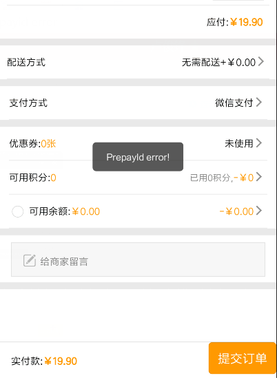 小程序在提交訂單支付時(shí)提示prepayiderror報(bào)錯(cuò)信息如下先在商戶平臺(tái)查看是否開(kāi)啟jsapi支付,如果沒(méi)開(kāi)啟先開(kāi)啟。然后測(cè)試支付,如果還不行主要檢查三個(gè)地方一.檢查商戶平臺(tái)有沒(méi)有授權(quán)當(dāng)前小程序先登陸https://pay.weixin.qq.com然后點(diǎn)擊產(chǎn)品中心-》Appid帳號(hào)管理如果列表中沒(méi)有您的小程序名稱就點(diǎn)擊關(guān)聯(lián)AppID如果有則跳過(guò)此步驟填寫小程序的AppID然后勾選我已閱讀同意再點(diǎn)擊提交附:小程序AppID獲取步驟打開(kāi)https://mp.weixin.qq.com注意必須用小程序帳號(hào)登陸然后點(diǎn)擊開(kāi)發(fā)-》開(kāi)發(fā)管理-》開(kāi)發(fā)設(shè)置獲取到AppID小程序:前往公眾平