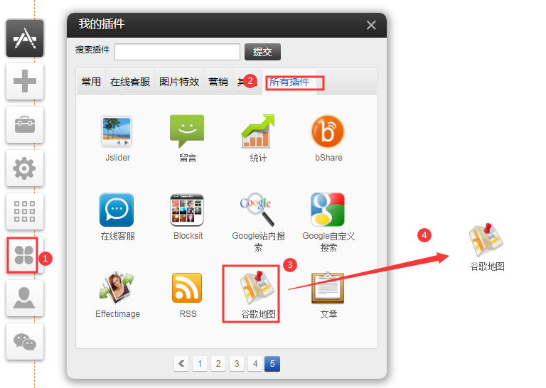 1、從左側(cè)的工具欄,單擊“插件”圖標(biāo)打開“我的插件,在“所有插件”界面選中Google地圖插件后按住左鍵不放,然后把Google地圖插件拖拽到您需要的位置。注意:Google地圖大陸地區(qū)加載在不了,建議使用百度地圖插件。2、錄入英文地址3、在編輯界面,右上角保存。顯示結(jié)果如下,和本地使用的瀏覽器語(yǔ)言有關(guān)系,海外地址如果是英文瀏覽器顯示的是全英文,如果是中文瀏覽器顯示的是中文和英文一起顯示。大陸地址如果是是英文瀏覽器顯示的顯示的是中文和英文,如果是海外地址顯示的是全英文