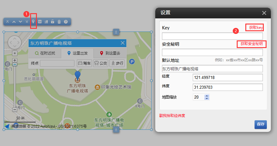 如何獲取高德地圖Key和安全密鑰1.在插件“高德地圖”中點(diǎn)擊“設(shè)置”在彈出窗口中點(diǎn)擊“獲取AK”或者“獲取安全密鑰”也可以直接開https://lbs.amap.com/?ref=https://console.amap.com/dev/index獲取高德地圖控制臺(tái)訪問AK和安全密鑰2.注冊(cè)開發(fā)者賬號(hào),成為高德開放平臺(tái)開發(fā)者登陸之后,在進(jìn)入「應(yīng)用管理」頁(yè)面「創(chuàng)建新應(yīng)用」(如果您之前已經(jīng)創(chuàng)建過(guò)應(yīng)用,可直接跳過(guò)這個(gè)步驟。)3.為應(yīng)用添加Key,「服務(wù)平臺(tái)」一項(xiàng)請(qǐng)選擇「Web端(JSAPI)」,設(shè)置域名白名單,可選填(建議設(shè)置域名白名單)。4.提交后在「我的應(yīng)用」中獲取到訪問