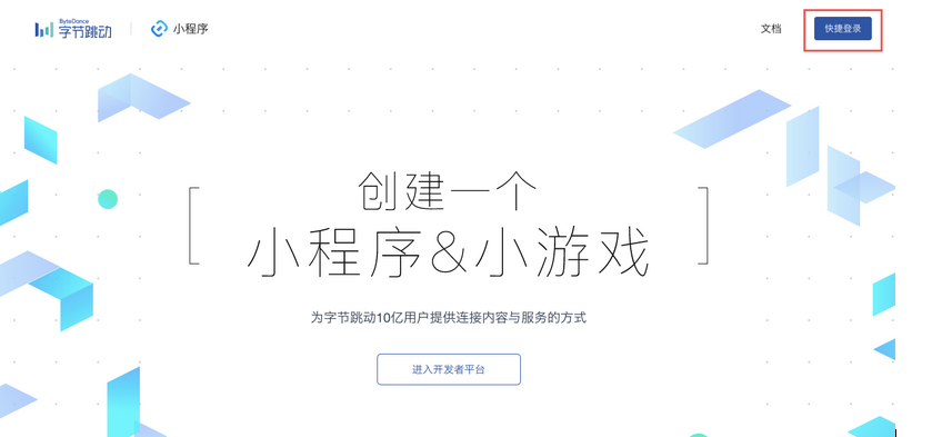 注意:僅營(yíng)銷版(及以上版本)支持字節(jié)小程序暫時(shí)不支持在線銷售功能,沒有支付功能一.注冊(cè)賬號(hào)注冊(cè)并登陸在開發(fā)者平臺(tái)https://developer.toutiao.com/中點(diǎn)擊右上角的「快捷登錄」進(jìn)行帳號(hào)注冊(cè)。申請(qǐng)小程序注冊(cè)帳號(hào)成功后,系統(tǒng)會(huì)自動(dòng)提示進(jìn)行小程序申請(qǐng)。點(diǎn)擊自動(dòng)彈出的「申請(qǐng)」按鈕,即可進(jìn)入小程序申請(qǐng)頁(yè)面。(若此次未申請(qǐng),之后可通過(guò)頁(yè)面中的「進(jìn)入開發(fā)者平臺(tái)」進(jìn)入) 在該頁(yè)面的「選擇類型」條目下選擇「小程序」類型,后續(xù)內(nèi)容根據(jù)具體情況各自補(bǔ)充。小程序申請(qǐng)發(fā)出后,字節(jié)小程序?qū)⒃趦蓚€(gè)工作日內(nèi)通過(guò)您注冊(cè)時(shí)的手機(jī)號(hào)以及