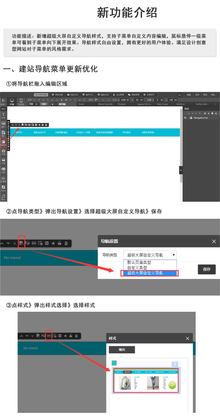 可用版本:PC基礎(chǔ)版、PC標(biāo)準(zhǔn)版、PC營(yíng)銷版同時(shí)支持堅(jiān)樣式建站前臺(tái),拖出“導(dǎo)航”模塊,選擇類型為超大屏導(dǎo)航,在樣式設(shè)置中將內(nèi)容寬度設(shè)置為屏幕寬度,再去設(shè)置菜單背景,背景圖案會(huì)填充通欄