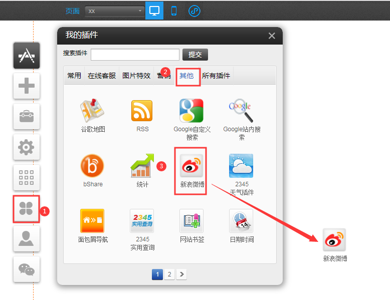 PC和手機(jī)版新浪微博(適用版本基礎(chǔ)版、標(biāo)準(zhǔn)版、營(yíng)銷版)本小節(jié)共5步。通過(guò)本部分的操作,您可順利為您的網(wǎng)站設(shè)置新浪微博插件。1,依次點(diǎn)擊插件-》其它-》選中插件,拖拽到你需要的位置。2,選擇插件類型3,點(diǎn)擊鏈接獲取wbml代碼。4,配置樣式并獲取代碼5,粘貼代碼到插件中,然后保存6,記得到右上角點(diǎn)擊保存。7,刷新頁(yè)面查看效果