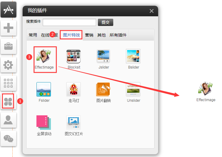 (適用版本基礎(chǔ)版、標(biāo)準(zhǔn)版、營銷版)Effectimage1、從左側(cè)的工具欄,單擊“插件”圖標(biāo),在“圖片特效”選中”Effectimage“插件后按住左鍵不放,然后把Effectimage插件拖拽到您需要的位置。2、單擊設(shè)置圖標(biāo),點(diǎn)擊增加按鈕選擇您需要展示的圖片。(如果需要添加多張圖再點(diǎn)擊增加即可)做好相應(yīng)設(shè)置后點(diǎn)擊保存設(shè)置。數(shù)據(jù)源可以用自定義、文章、產(chǎn)品、文章分類、產(chǎn)品分類、友情鏈接、友情鏈接分類以自定義類型為例點(diǎn)擊添加可以上傳圖片1.如需要傳更多圖片,直接點(diǎn)左上角的增加即可。2.勾選自動滾動后,無需點(diǎn)擊箭頭瀏覽圖片,圖片會從左到
