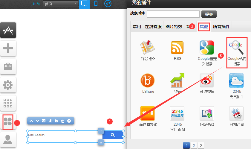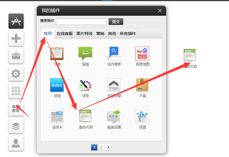 請?jiān)谧髠?cè)插件-》常用-》選中高級代碼插件-》然后用鼠標(biāo)左鍵長按拖拽到到版面中。然后按需要選擇位置如果是百度統(tǒng)計(jì)代碼或愛番番及google按鈕的轉(zhuǎn)化代碼一般選在</head>之前選好位置后貼入代碼保存即可。