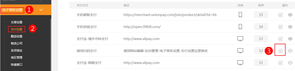 支付方式介紹及設(shè)置說明支付方式指的是網(wǎng)上購物時顧客與店主的貨款清算方式,如:信用卡付款、支付寶付款、貨到付款等。如果一個網(wǎng)站中沒有支付方式,則顧客無法進(jìn)行購物通過本部分的操作,您可以了解到時下常用的支付方式,以選擇適合自己網(wǎng)站的支付方式。常用支付方式介紹支付方式的修改及添加在線網(wǎng)關(guān)支付說明貨到付款支付說明線下支付的添加及修改網(wǎng)站添加完常用的支付方式后,顧客在前臺購物結(jié)帳時可以選擇支付方式選擇后就會在訂單中顯示接下來,我們會分別介紹一下常用的支付方式,及配置的方法。例如:網(wǎng)站中需要分別設(shè)置常用的支