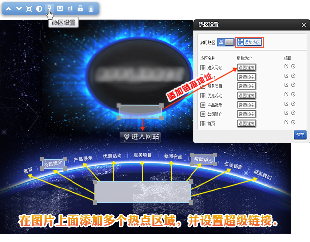 熱區(qū)設(shè)置主要用于圖像地圖,通過該標(biāo)記可以在圖像地圖中設(shè)定作用區(qū)域(又稱為熱點(diǎn)),這樣當(dāng)用戶的鼠標(biāo)移到指定的作用區(qū)域點(diǎn)擊時,會自動鏈接到預(yù)先設(shè)定好的頁面。通過此功能,您將可以用它來實(shí)現(xiàn)很多網(wǎng)站效果。如:使用圖片來做網(wǎng)站導(dǎo)航,僅需要圖片某個區(qū)域設(shè)置可以點(diǎn)擊的超級鏈接效果等等。本小節(jié)共包含4點(diǎn)。1,啟用熱區(qū)依次點(diǎn)擊設(shè)置-》啟用熱區(qū)-》添加熱區(qū)-》設(shè)置熱區(qū)名稱和鏈接-》保存點(diǎn)擊后出現(xiàn)熱區(qū)名稱鏈接設(shè)置點(diǎn)擊鼠標(biāo)左鍵拉大熱區(qū)區(qū)域所覆蓋的區(qū)域點(diǎn)擊會到您設(shè)置的鏈接3,最后記得在右上角保存4,點(diǎn)擊預(yù)覽查看效果。鼠標(biāo)點(diǎn)擊所設(shè)