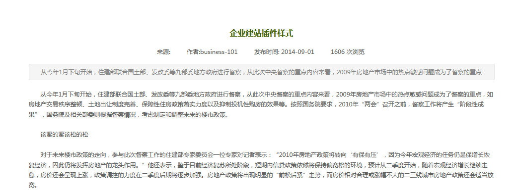 通過文章詳情插件“樣式設置”來調整您的詳情頁展示效果。1、文章詳情展示默認展示效果如下。2、下面是一個最簡單的文章詳情設置界面。選擇框取消勾選后該項目將不顯示。選擇文字的字體設置顯示文字的大小點擊可以設置文字的顏色設置是否加粗顯示設置下劃線設置摘要區(qū)域的背景色設置摘要邊框顏色和粗細3、對應的在顯示時的位置。3、文章詳情支持分頁,用戶可以設定每頁顯示多少字,多種分頁樣式選擇開啟社交分享