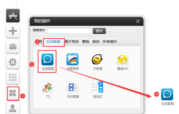 PC版插件(適用版本基礎版、標準版、營銷版)通過本部分的操作,您可順利為您的網(wǎng)站設置在線客服插件。添加后如果在線QQ客服顯示“未啟用”請參考在線QQ客服顯示“QQ離線”是怎么回事?如何解決?注意:手機QQ在線登陸不會顯示在線,必須在電腦登陸才會顯示在線不能填寫11位的手機號碼哦。要填手機號碼捆綁的QQ號碼。1、依次點擊插件-》在線客服-》選中插件,拖拽到你需要的位置。2、設置在線客服的顯示風格,設置是否啟用浮動樣式、隱藏插件將只顯示浮動樣式1.點擊更改圖標,可以選擇其他圖標的樣式。2.當啟用了浮動樣式,隱